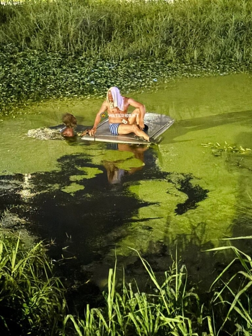 Het voertuig verdween bijna volledig onder water; alleen een deel van het dak bleef nog zichtbaar. De bestuurder klom na het voorval uit de auto en ging op het dak zitten. Hij gaf aan niet te kunnen zwemmen (foto).