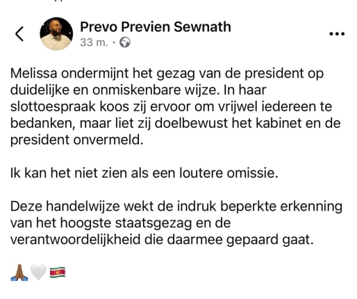 De uitvaart van gewezen staatshoofd Chandrikapersad Santokhi heeft niet alleen in het teken gestaan van rouw en eerbetoon, maar heeft ook geleid tot scherpe kritiek vanuit het Kabinet van de President. Coördinator Communicatie Previen ‘Prevo’ Sewnath stelt dat weduwe Mellisa Santokhi tijdens haar slottoespraak op duidelijke wijze het gezag van president Jennifer Simons heeft ondermijnd.